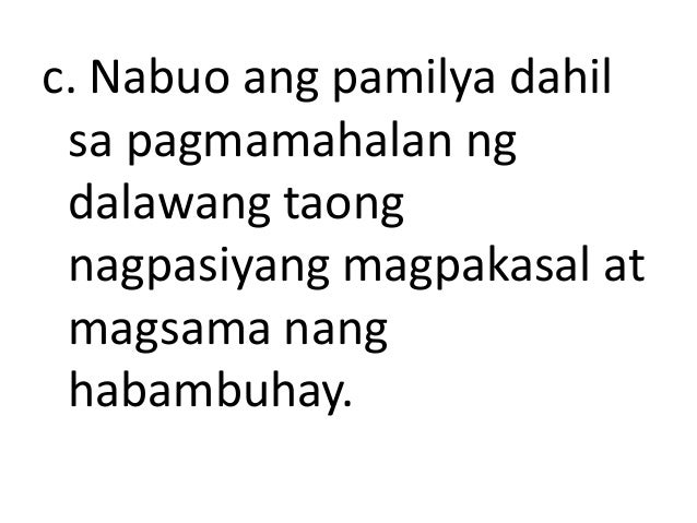 Dahil sa kanilang walang pag-iimbot puro at romantikong 4kapwa nangakong magsasama hanggang sa wakas ng kanilang 5. Mahalagang misyon ng pamilya ang pagbibigay ng 8paggabay sa mabuting. Nabuo ang pamilya sa ng isang lalaki at babaeng nagpasiyang magpa-at magsama ng habang buhay4.