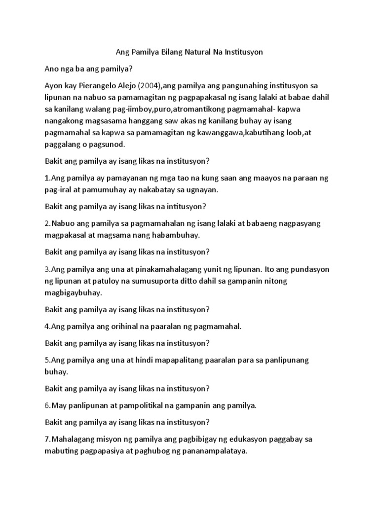 Kung silaay may pagmamahal paggalang at tungkulinnatinutupad para saisatisaKahitnatayoay nagkakamalipaminsan-minsan nariyan. Ang pamilya ay pamayanan ng mga tao community of persons na kung saan ang maayos na paraan ng pag-iral at pamumuhay ay nakabatay sa ugnayan 2. Ang pamilya ay 1.