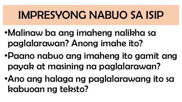 Ano ang impresyong nabuo sa isip. Impresyong nabuo sa isip Anong impresyon ang nabuo sa iyong isip batay sa paglalarawan. Alam mo ba na kapag sinimulan mong mag-isip ng negative at hindi ka gumawa. Ang MABUBUO ay isang maliit na detalye na kapag sinasama ang mga lahat ng detalye ay maari kang mabuo ng nais mo.