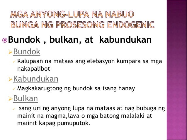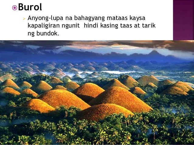 ANYONG LUPA Narito ang ibat ibang uri ng mga Anyong Lupa kabilang na ang Kapatagan Bundok Bulubundukin Bulkan Burol Lambak Talampas at Tangway. Anyong lupa na nabuo sa pagkatunaw ng mga batong apog limestone at dolomite dahil sa pwersa ng tunig sa ilalim na lupa. May ibat ibang uri ng mga anyong lupa at anyong tubig na kamangha-mangha ang kagandahan.