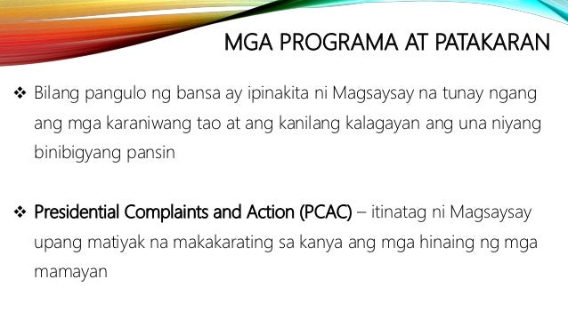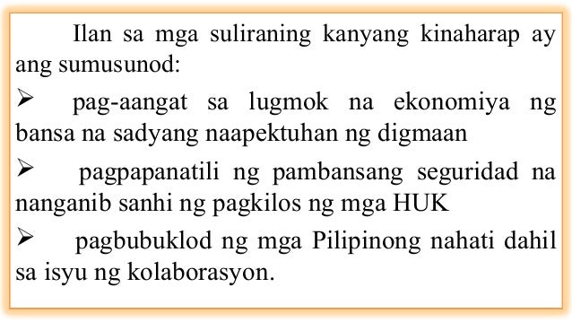 Ang siyang nagbigay ng lakas kot sigla. 2 on a question Maganda ba na nilikha ang National Rice and Corn Corporation NARIC at National Coconut Corporation upang magbigay-proteksyon at mamahala sa pamimili ng mga produkto sa mga magsasaka. Roxas Unang Pangulo ng Ikatlong Republika ng Pilipinas Hulyo 4 1946 - Abril 15 1948 Ang kapakanan ng lahat ng tao ang ating pangunahing tungkulin.