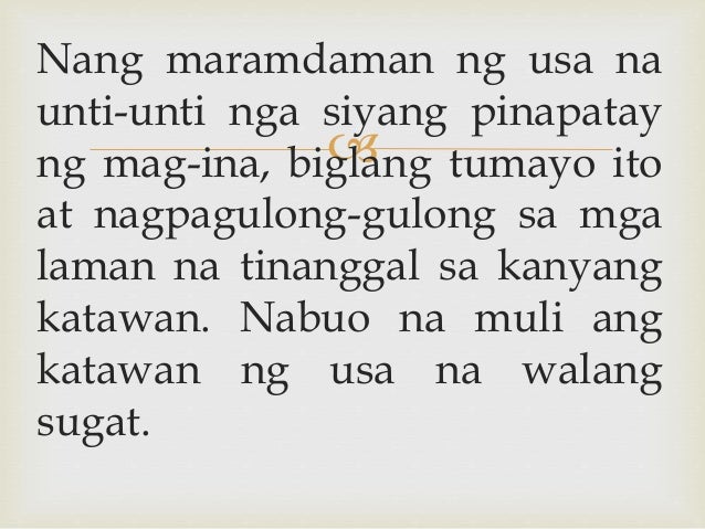 Ayon sa pananaw na ito ang pag-unawa sa pagbabasa ay nagsisimula sa pagkilala ng isang sunud-sunod na mga naka-print na simbolo. Nang masugatan nila ang puso at naramdaman ng usa biglang tumayo ito at nagpagulong-gulong sa mga laman na tinanggal sa kanyang katawan. Binaril ng isang amerikano ang isang pilipino.