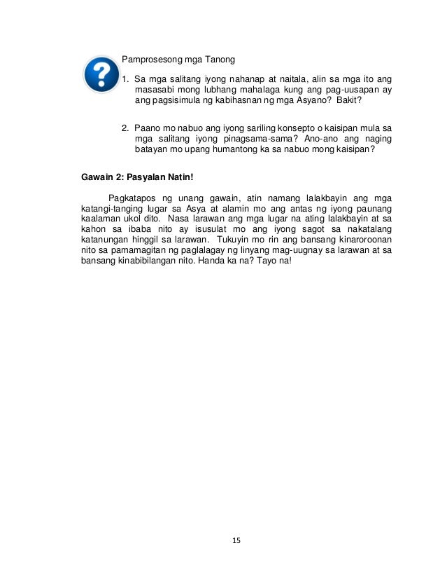 Mahalaga na pag-aralan ang konsepto ng salitang kababayan lalo na sa panahon ngayon na ibat iba na ang oryentasyon pananaw at pag-iisip nating mga Pilipino. Ang kabihasnan ay isang yugto ng kaunlaran sa isang pamayanan o grupo na may sariling kultura at paniniwala. Ipabuo sa mga bata ang isang puzzle ng mag-anak na nagtutulungan.