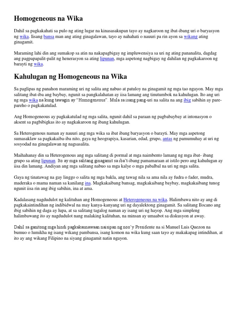 - Ito ag wika o mga salitang nauuunawaan ng lahat sa buong kapuluan itinuturing din itong wikang istandard dahil tinatanggap at ginagamit ng higit na nakararami lalo na ng mga manunulat edukado o nakapag-aral. Madaming pagpapakahulugan ang wika. Kaugnay nito may mga taong pinag-aaralan ang ibat-ibang wika at kung paano at saan ito nagmula.