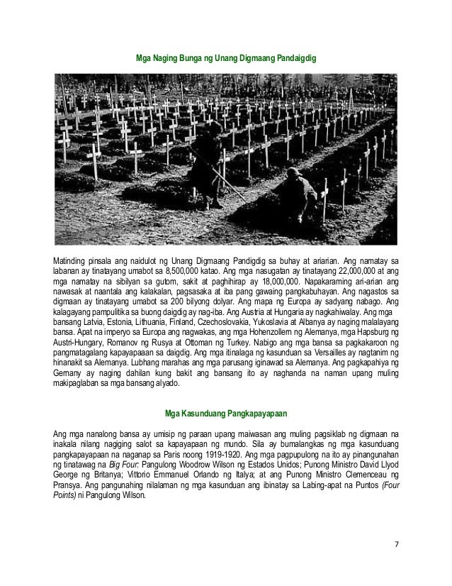 Liga ng mga Bansa b. Ang mga dating estadong Aksis na nag-ambag sa pagkapanalo ng Mga Alyansa ay hindi itinuturing na mga estado ng Mga Alyado. Ang Digmaang Pandaigdig I kadalasang dinaglat bilang WWI o WW1 na kilala rin bilang Unang Digmaang Pandaigdig o ang Great War ay isang pandaigdigang digmaan na nagmumula sa Europa na tumagal mula Hulyo 28 1914 hanggang Nobyembre 11 1918Contemporaneously na inilarawan bilang War to End Lahat ng mga Wars mahigit sa 70 milyong tauhan ng militar kabilang ang 60 milyong taga-Europa ang.