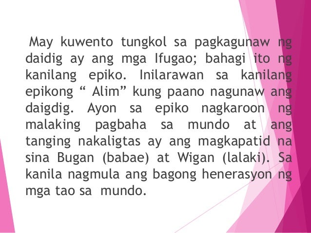 Magkaroon ng pagbahagian ng natutuhan Pagbuo ng graphic organizer na magpapakita kung paano nakatutulong ang mitolohiya ng Rome sa panitikang Pilipino Feedback ng guro Ikalima-Ikapitong Araw 4. Inasawa ni Woto ang kaniyang kapatid na si Labama. Ang daigdig ay nilikha ng dakilang maykapal na nooy Ama ang kanilang tawag dito.